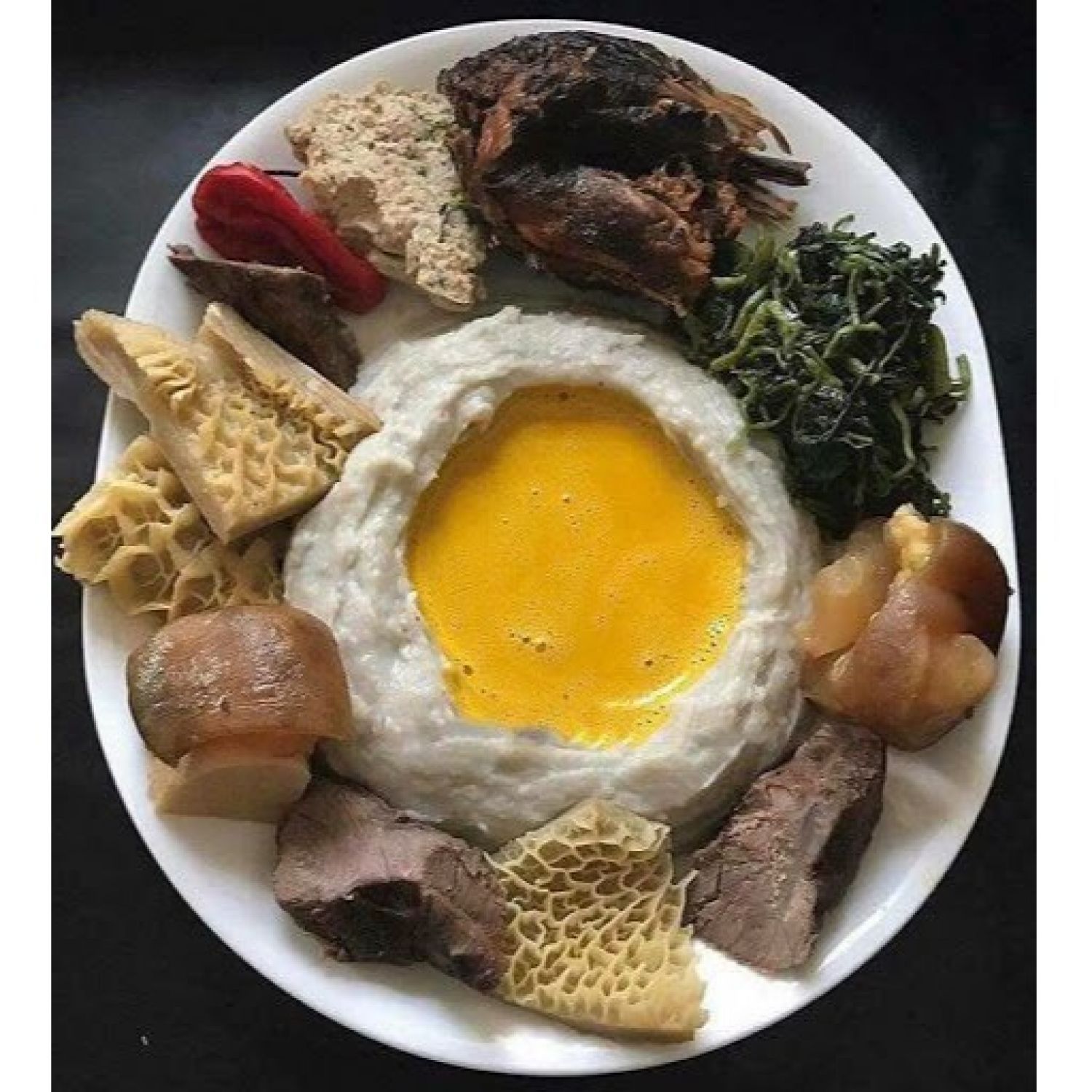 A beloved Cameroonian dish featuring mashed cocoyam served with a spicy soup, showcasing the rich and diverse flavors of Central African cuisine in a hearty and satisfying meal.